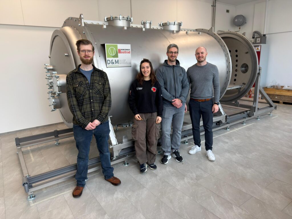 On the picture from left to right: Bas Timmerman (Hositrad Vacuum technology), Leonor Jesus (TUM), Sascha Dengler (TUM) and Sören Heizmann (TUM)